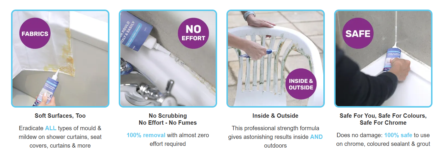 - Wipe clean with a damp cloth or sponge. No scrubbing required – mould will lift away with ease!